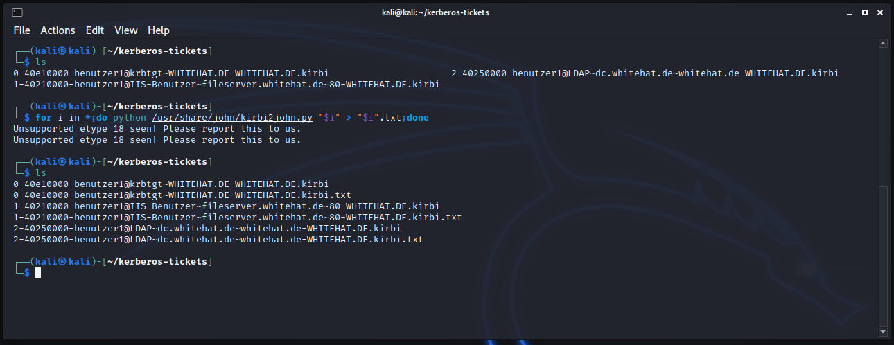 Zum Konvertieren einer .kirbi Datei könnte unter Kali-Linux also folgender Befehl eingegeben werden:
